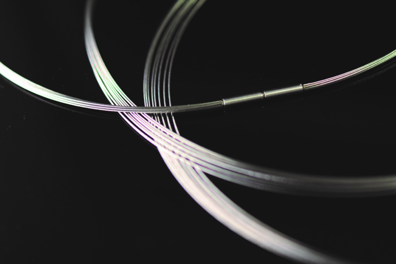 Das Seilcollier aus Edelstahl ist mit mehreren dünnen Drähten an einen Bajonettverschluss verschweisst.
